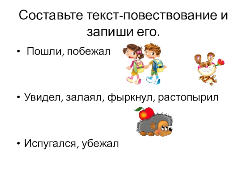 Составьте текст-повествование и запиши его. Пошли, побежал     Увидел, залаял, фыркнул, растопырилИспугался, убежал