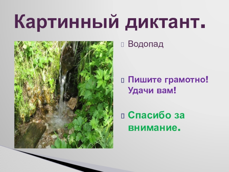 ВодопадПишите грамотно! Удачи вам!Спасибо за внимание.Картинный диктант.