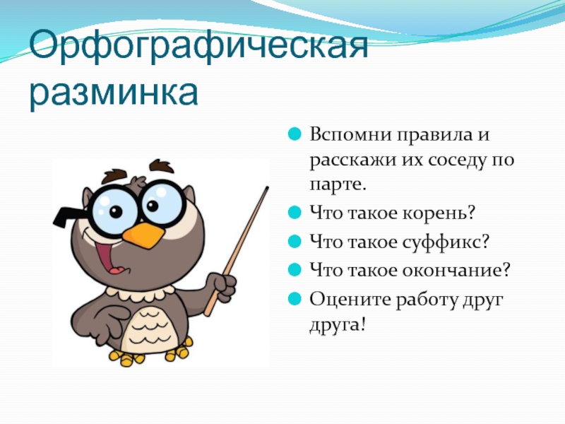 Орфографическая разминкаВспомни правила и расскажи их соседу по парте.Что такое корень?Что такое суффикс?Что такое окончание?Оцените работу друг