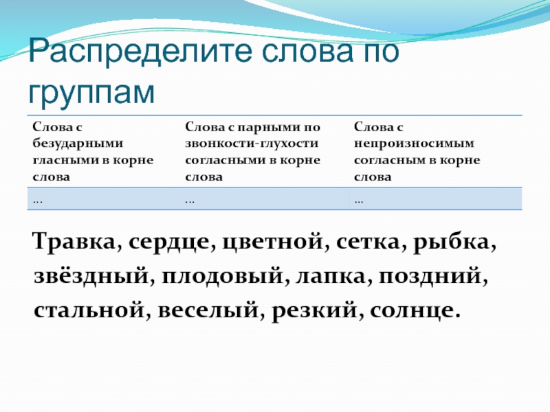 Слайд 7Распределите слова по группам