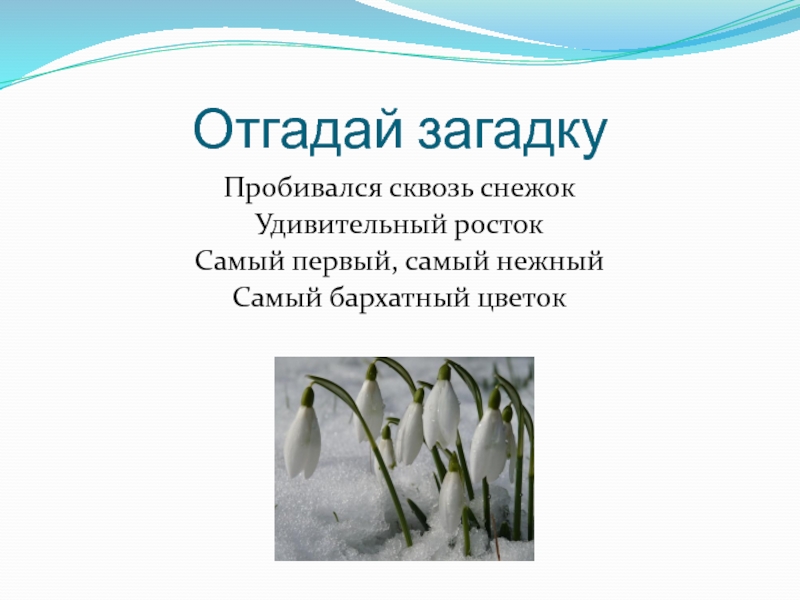 Отгадай загадкуПробивался сквозь снежокУдивительный ростокСамый первый, самый нежныйСамый бархатный цветок