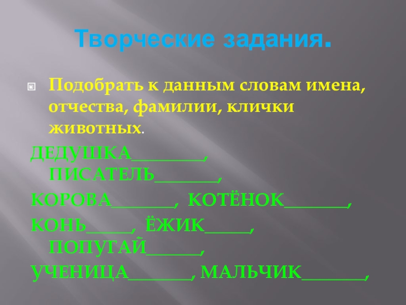 Творческие задания.Подобрать к данным словам имена, отчества, фамилии, клички животных.ДЕДУШКА________, ПИСАТЕЛЬ_______,КОРОВА_______, КОТЁНОК_______,КОНЬ_____, ЁЖИК_____, ПОПУГАЙ______,УЧЕНИЦА_______, МАЛЬЧИК_______,