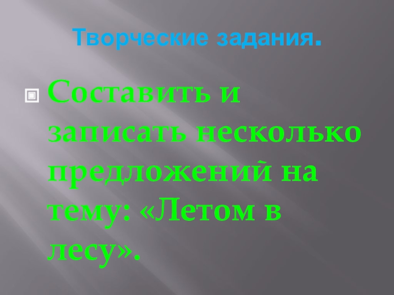 Творческие задания.Составить и записать несколько предложений на тему: «Летом в лесу».