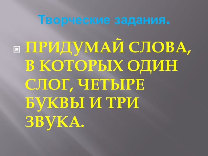 Творческие задания.ПРИДУМАЙ СЛОВА, В КОТОРЫХ ОДИН СЛОГ, ЧЕТЫРЕ БУКВЫ И ТРИ ЗВУКА.