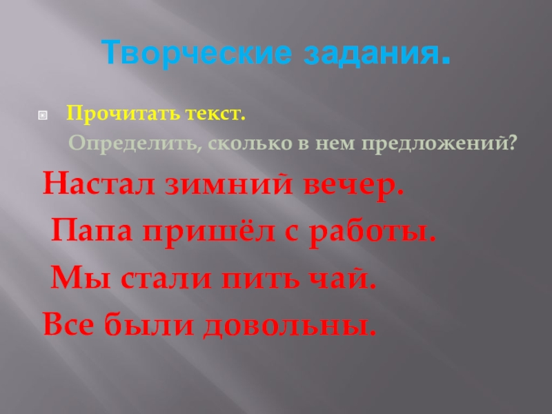 Творческие задания.Прочитать текст.   Определить, сколько в нем предложений?Настал зимний вечер. Папа пришёл с работы. Мы