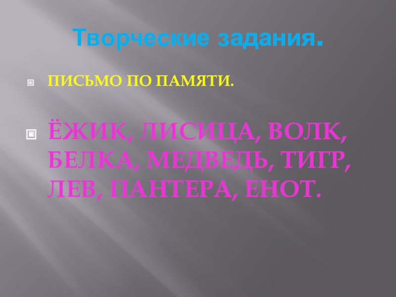 Творческие задания.ПИСЬМО ПО ПАМЯТИ.ЁЖИК, ЛИСИЦА, ВОЛК, БЕЛКА, МЕДВЕДЬ, ТИГР, ЛЕВ, ПАНТЕРА, ЕНОТ.