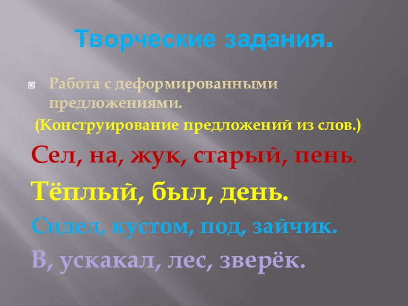 Творческие задания.Работа с деформированными предложениями. (Конструирование предложений из слов.)Сел, на, жук, старый, пень.Тёплый, был, день.Сидел, кустом, под,