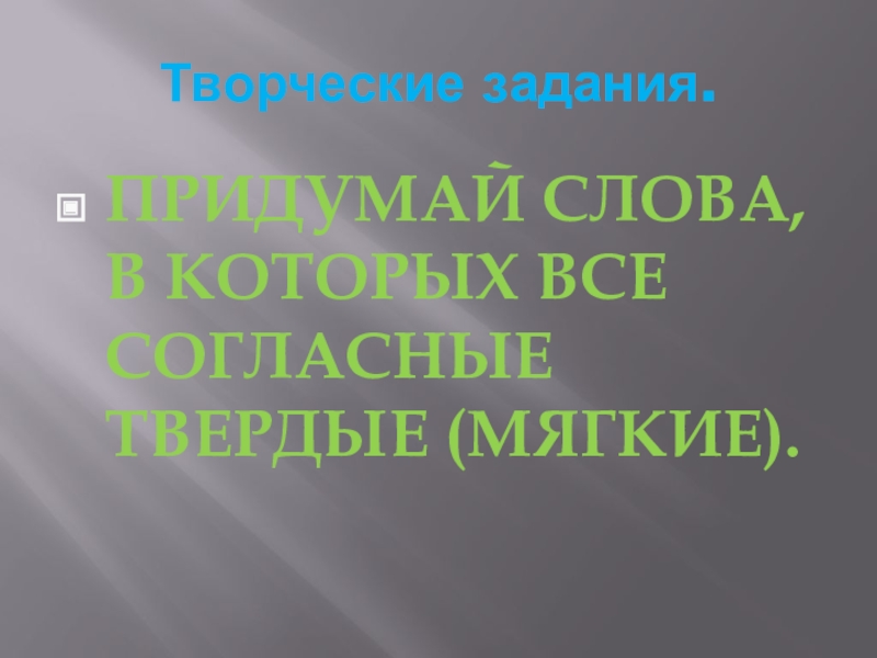 Творческие задания.ПРИДУМАЙ СЛОВА, В КОТОРЫХ ВСЕ СОГЛАСНЫЕ ТВЕРДЫЕ (МЯГКИЕ).