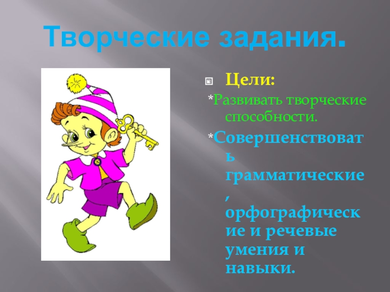 Творческие задания.Цели:*Развивать творческие способности.*Совершенствовать грамматические, орфографические и речевые умения и навыки.