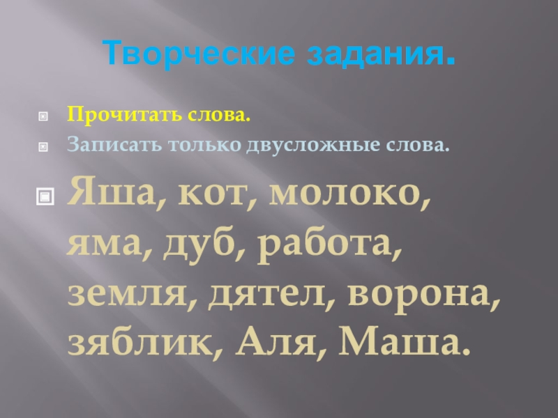 Творческие задания.Прочитать слова. Записать только двусложные слова.Яша, кот, молоко, яма, дуб, работа, земля, дятел, ворона, зяблик, Аля,