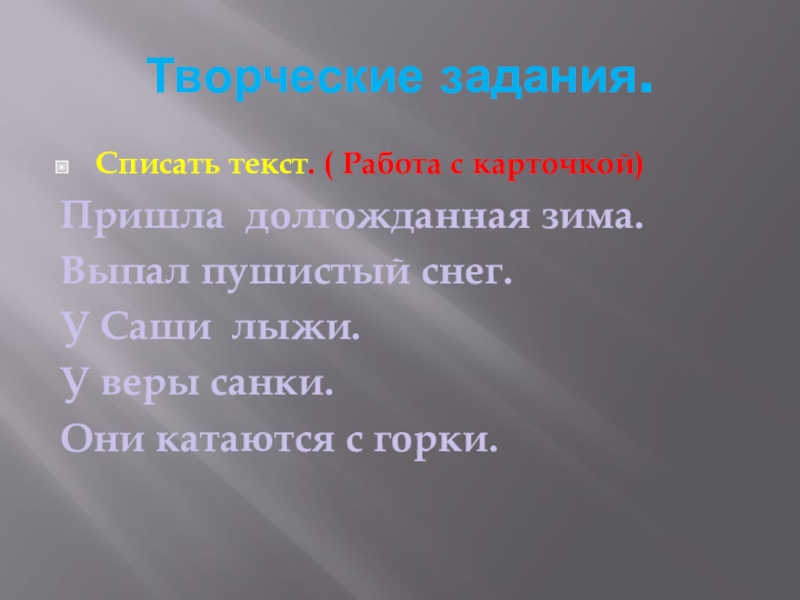 Творческие задания.Списать текст. ( Работа с карточкой)Пришла долгожданная зима. Выпал пушистый снег.У Саши лыжи.У веры санки.Они катаются