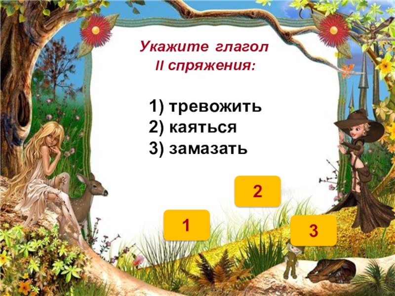 1 2Укажите глагол  II спряжения: 1) тревожить2) каяться 3) замазать3