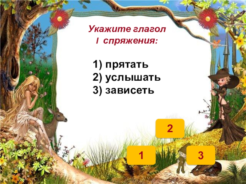 123Укажите глагол  I спряжения: 1) прятать2) услышать3) зависеть