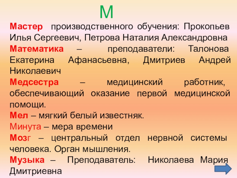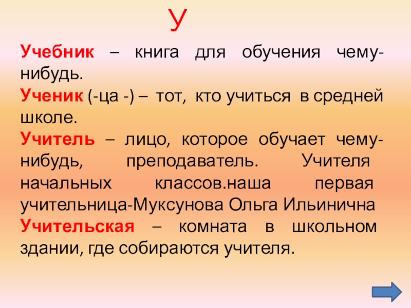 Учитель – лицо, которое обучает чему-нибудь, преподаватель. Учителя начальных классов.наша первая учительница-Муксунова Ольга Ильинична