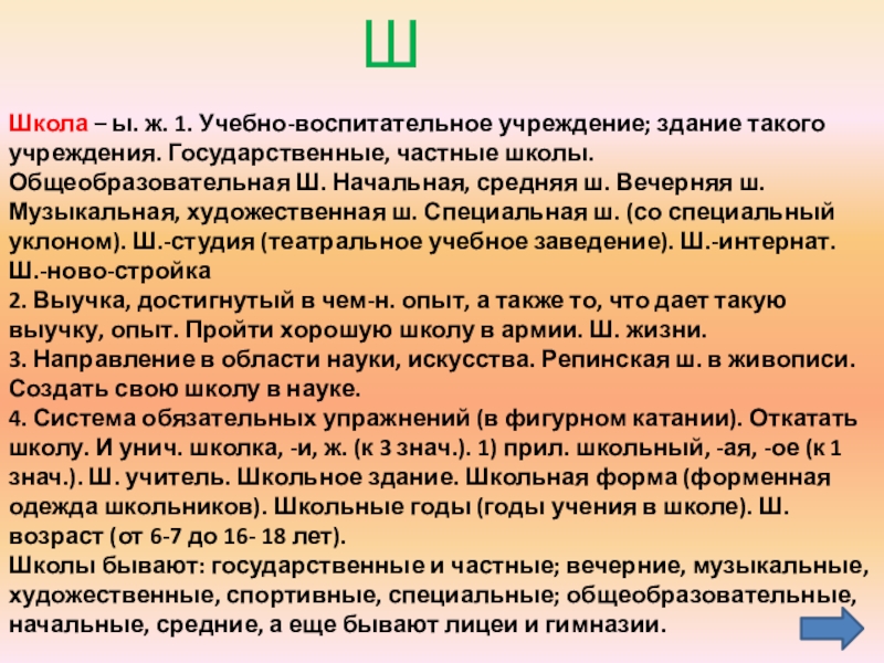 здание такого учреждения. Государственные, частные школы. Общеобразовательная Ш. Начальная, средняя ш. Вечерняя ш. Музыкальная, художественная ш. Специальная ш. (со специальный уклоном). Ш.-студия (театральное учебное заведение). Ш.-интернат. Ш.-ново-стройка