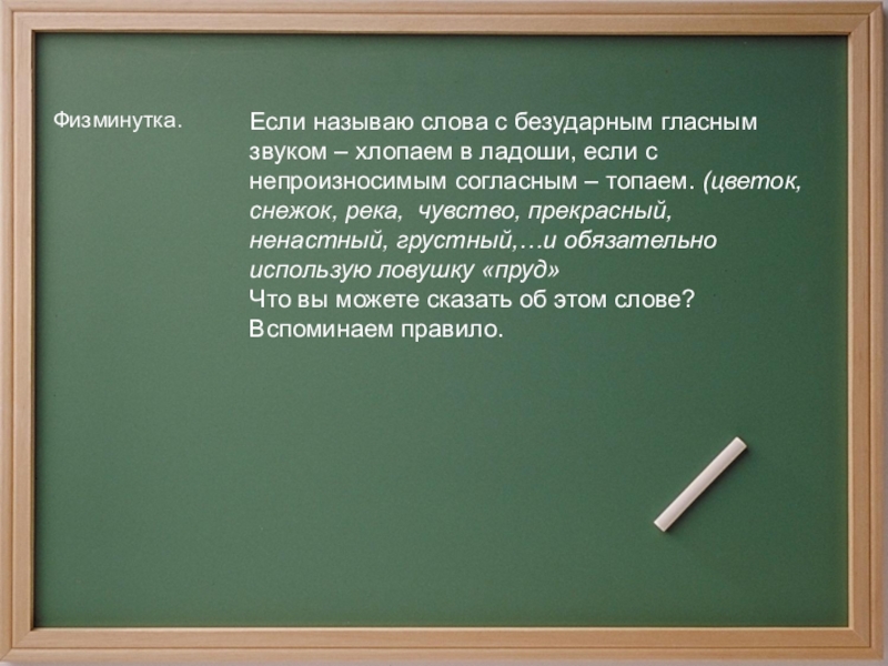 Если называю слова с безударным гласным звуком – хлопаем в ладоши, если с непроизносимым согласным – топаем. (цветок, снежок, река, чувство, прекрасный, ненастный, грустный,…и обязательно использую ловушку «пруд» Что вы можете сказать об этом слове? Вспоминаем правило.