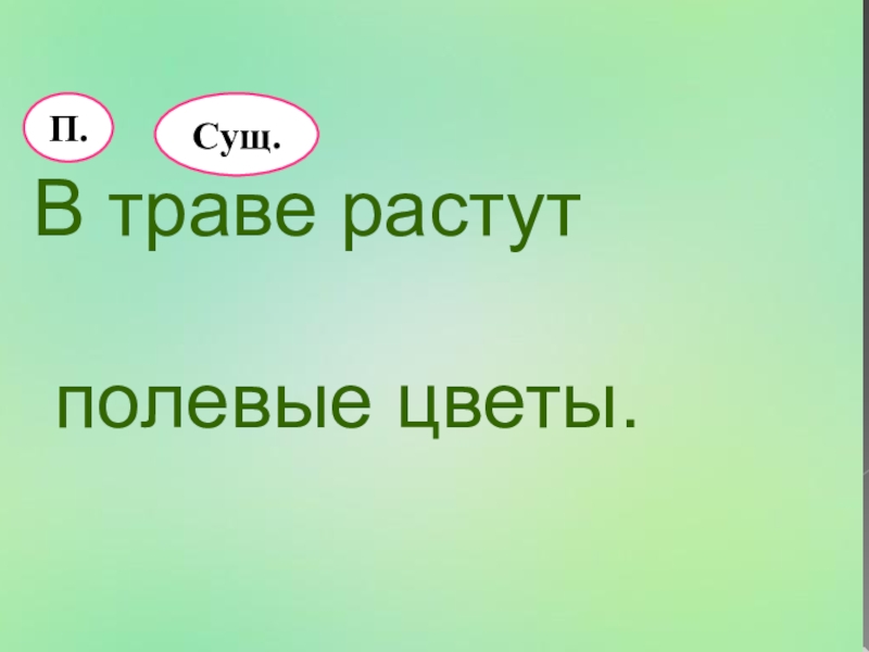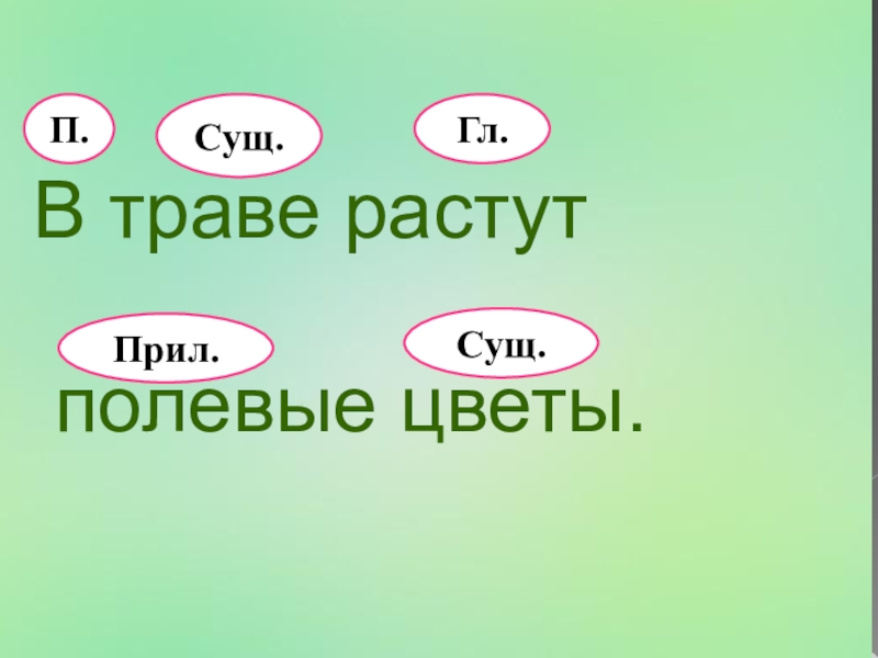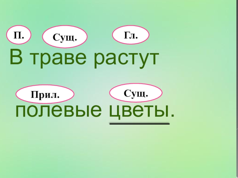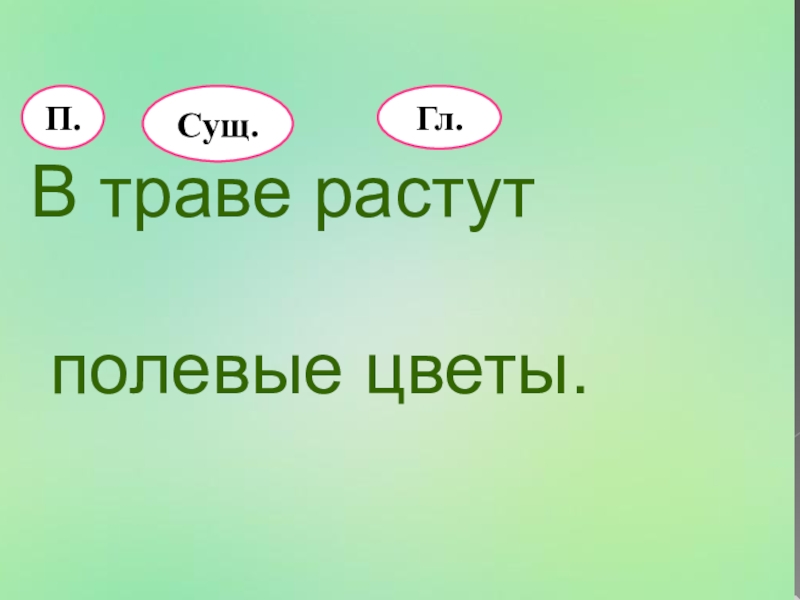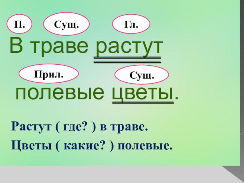 В траве растут полевые цветы.П.Гл.Сущ.