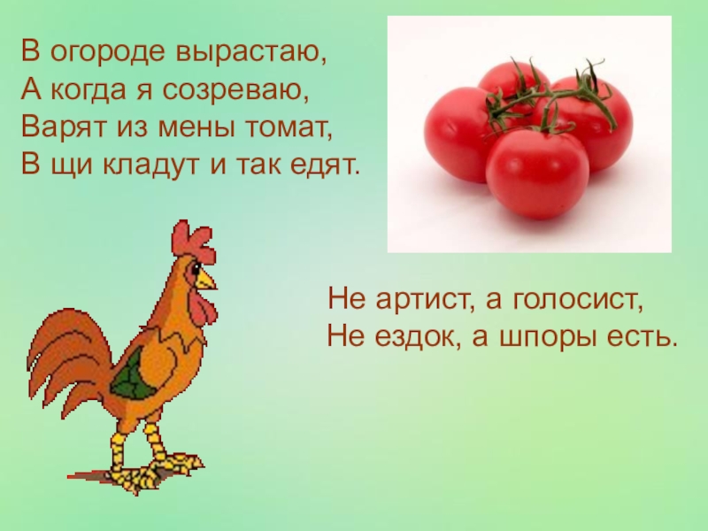 В огороде вырастаю,А когда я созреваю,Варят из мены томат,В щи кладут и так едят.