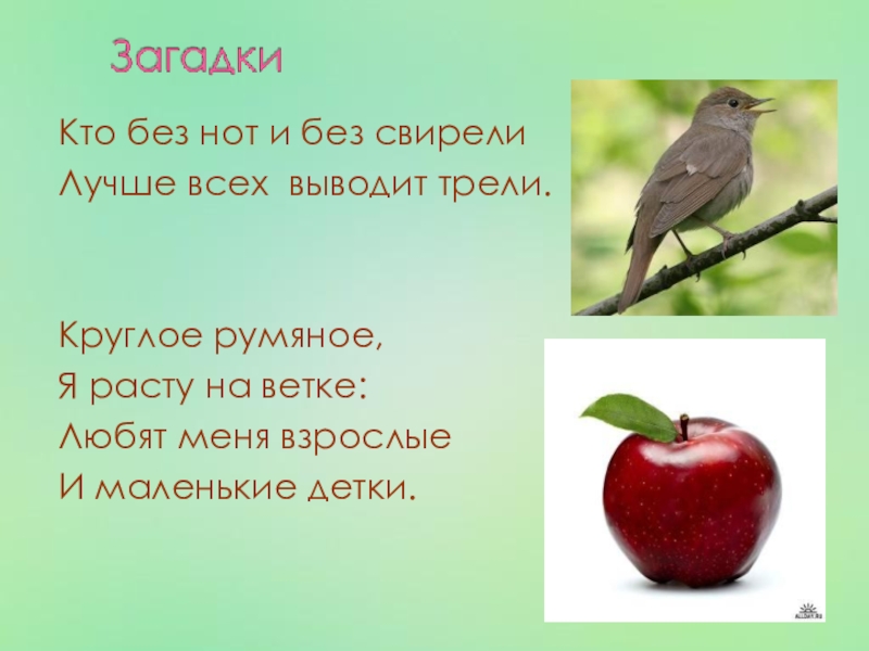 Кто без нот и без свирелиЛучше всех выводит трели.Круглое румяное,Я расту на ветке:Любят меня взрослыеИ маленькие детки.