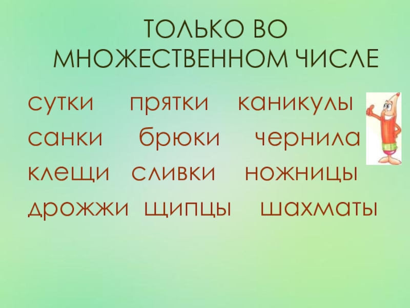 ТОЛЬКО ВО МНОЖЕСТВЕННОМ ЧИСЛЕсутки   прятки  каникулысанки   брюки   чернила клещи