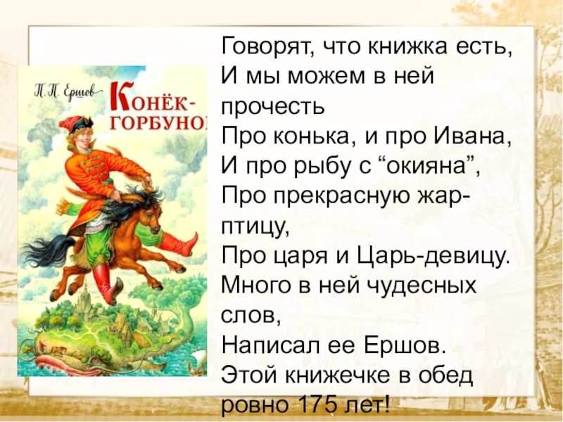 про Ивана, И про рыбу с “окияна”, Про прекрасную жар-птицу, Про царя и Царь-девицу. Много в ней чудесных слов, Написал ее Ершов. Этой книжечке в обед ровно 175 лет!