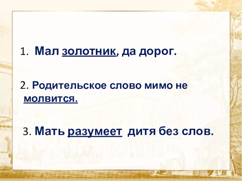 1. Мал золотник, да дорог.   2. Родительское слово мимо не молвится.  3. Мать разумеет
