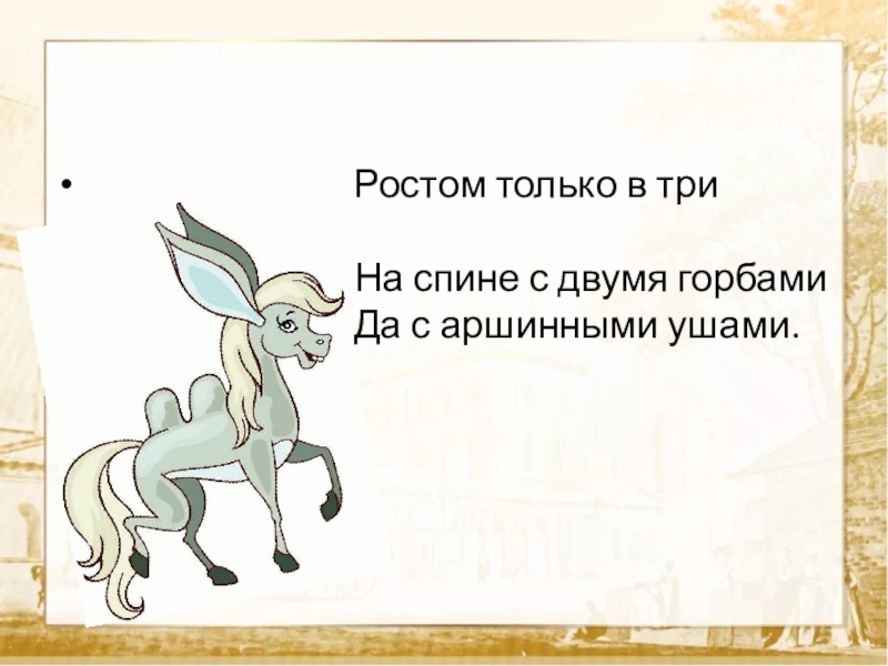 Ростом только в три вершка, На спине с двумя горбами Да с аршинными ушами.