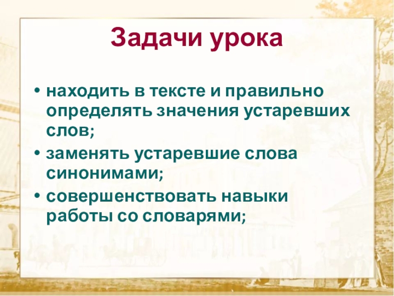 Задачи уроканаходить в тексте и правильно определять значения устаревших слов; заменять устаревшие слова синонимами;совершенствовать навыки