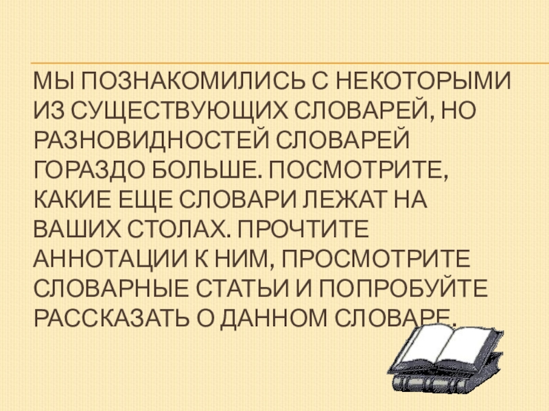 больше. Посмотрите, какие еще словари лежат на ваших столах. Прочтите аннотации к ним, просмотрите словарные статьи и попробуйте рассказать о данном словаре.