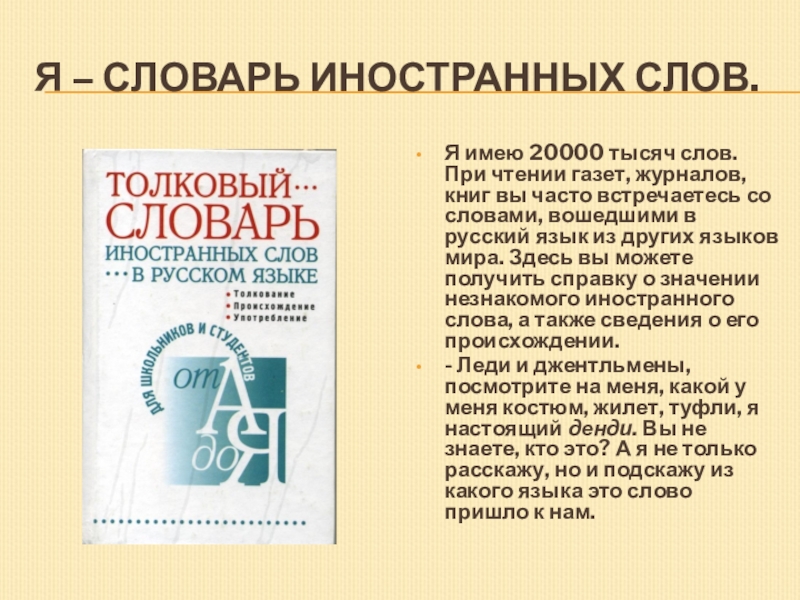 - Леди и джентльмены, посмотрите на меня, какой у меня костюм, жилет, туфли, я настоящий денди. Вы не знаете, кто это? А я не только расскажу, но и подскажу из какого языка это слово пришло к нам.