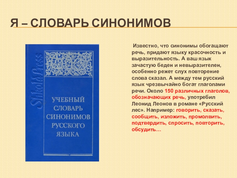 речь, придают языку красочность и выразительность. А ваш язык зачастую беден и невыразителен, особенно режет слух повторение слова сказал. А между тем русский язык чрезвычайно богат глаголами речи. Около 150 различных глаголов, обозначающих речь, употребил Леонид Леонов в романе «Русский лес». Например: говорить, сказать, сообщить, изложить, промолвить, подтвердить, спросить, повторить, обсудить…