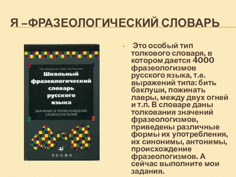 4000 фразеологизмов русского языка, т.е. выражений типа: бить баклуши, пожинать лавры, между двух огней и т.п. В словаре даны толкования значений фразеологизмов, приведены различные формы их употребления, их синонимы, антонимы, происхождение фразеологизмов. А сейчас выполните мои задания.