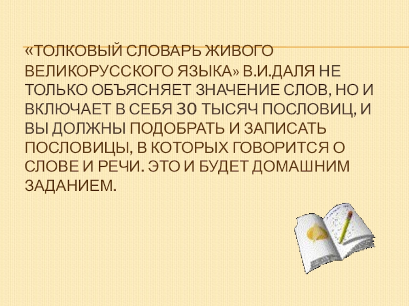 но и включает в себя 30 тысяч пословиц, и вы должны подобрать и записать пословицы, в которых говорится о слове и речи. Это и будет домашним заданием.