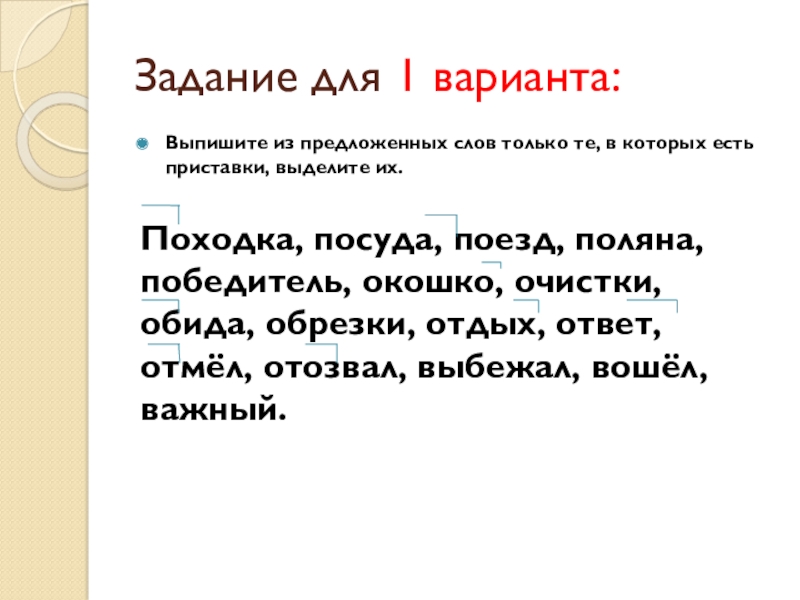 Походка, посуда, поезд, поляна, победитель, окошко, очистки, обида, обрезки, отдых, ответ, отмёл, отозвал, выбежал, вошёл, важный.