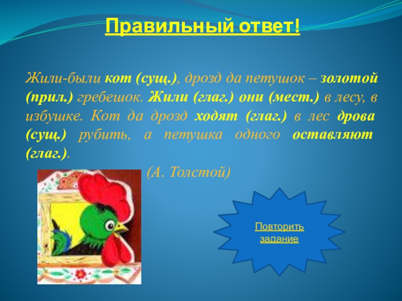 Жили-были кот, дрозд да петушок – золотой гребешок. Жили они в лесу, в избушке. Кот да дрозд ходят в лес дрова рубить, а петушка одного оставляют.