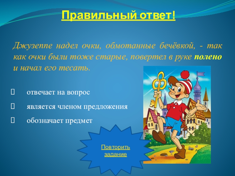 Джузеппе надел очки, обмотанные бечёвкой, - так как очки были тоже старые, повертел в руке полено и начал его тесать.