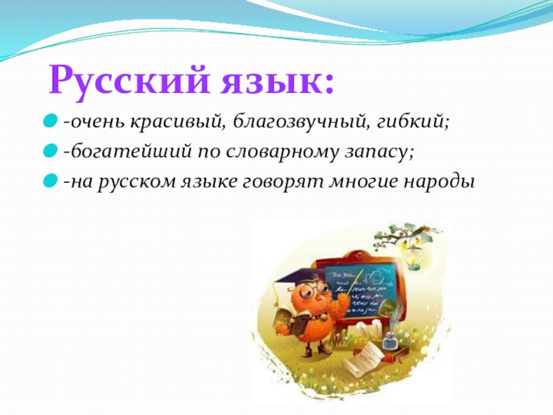 Русский язык:-очень красивый, благозвучный, гибкий;-богатейший по словарному запасу;-на русском языке говорят многие народы