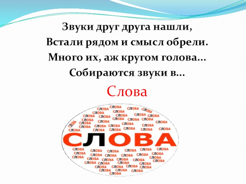 Звуки друг друга нашли,Встали рядом и смысл обрели.Много их, аж кругом голова...Собираются звуки в... Слова