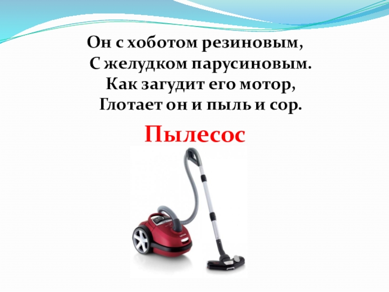 Он с хоботом резиновым, С желудком парусиновым. Как загудит его мотор, Глотает он и пыль и сор.Пылесос