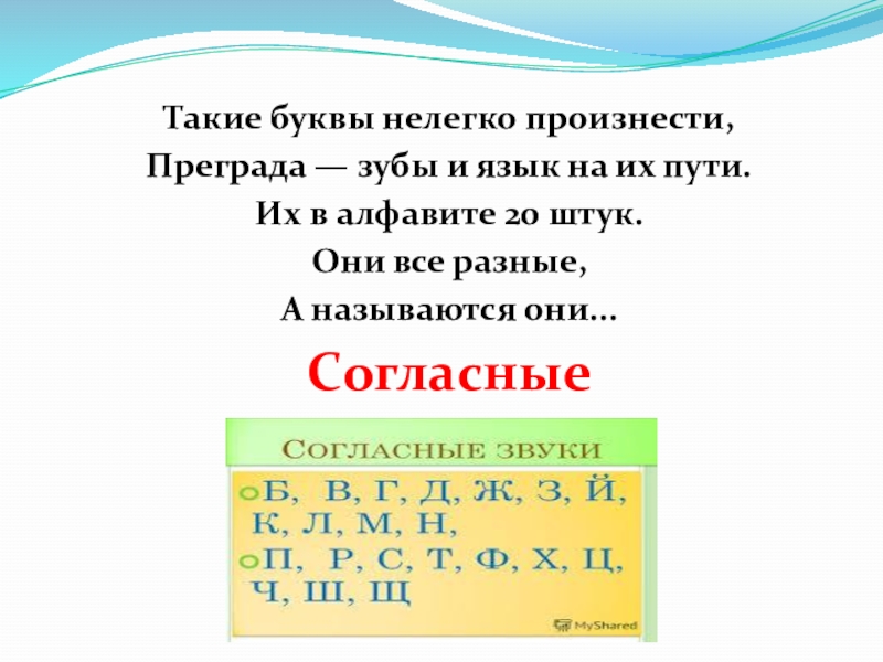 Такие буквы нелегко произнести,Преграда — зубы и язык на их пути.Их в алфавите 20 штук.Они все разные,А