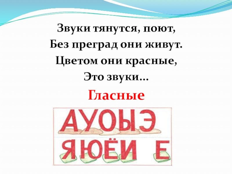 Звуки тянутся, поют,Без преград они живут.Цветом они красные,Это звуки... Гласные