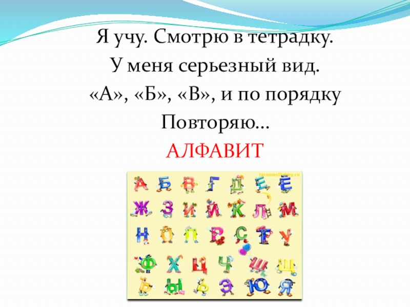 Я учу. Смотрю в тетрадку.У меня серьезный вид.«А», «Б», «В», и по порядкуПовторяю…АЛФАВИТ