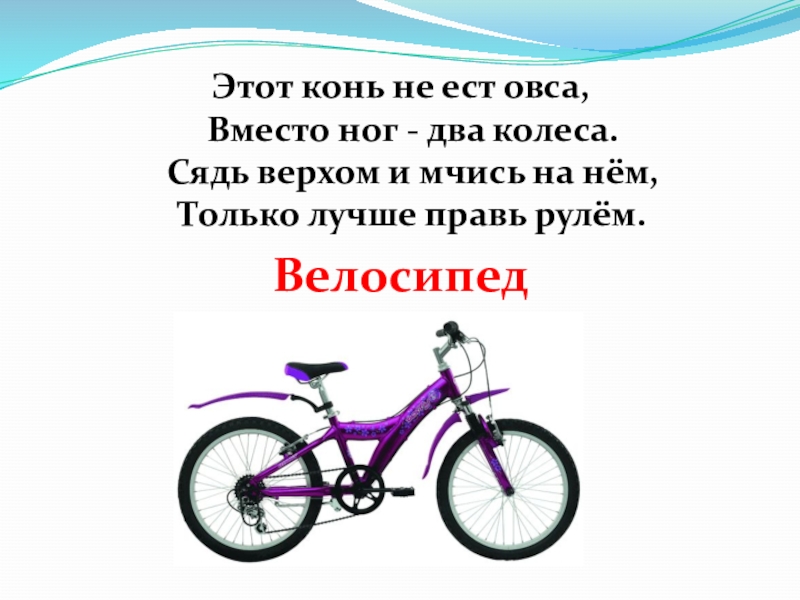 Слайд 11Этот конь не ест овса,  Вместо ног - два колеса.  Сядь верхом и