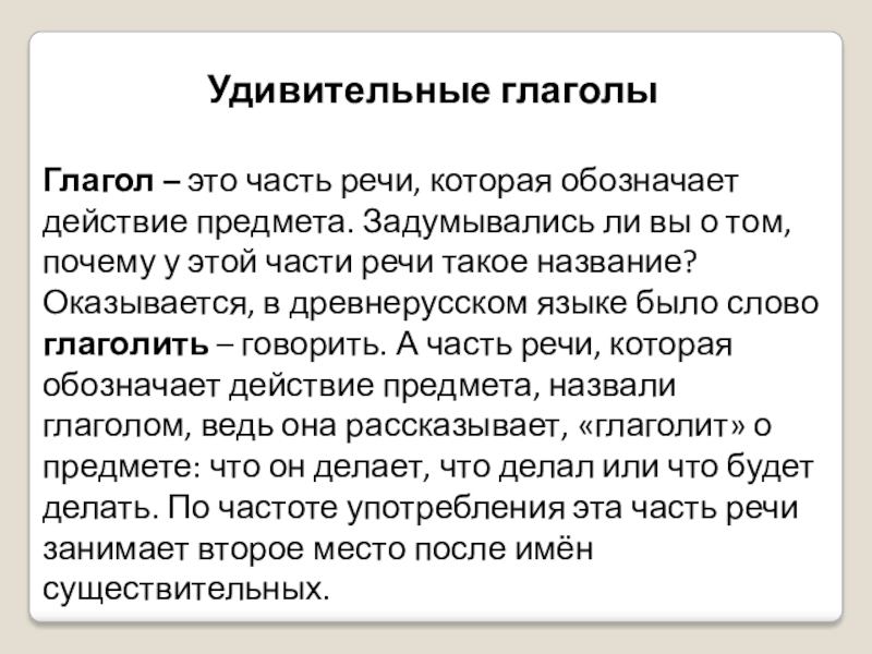 Оказывается, в древнерусском языке было слово глаголить – говорить. А часть речи, которая обозначает действие предмета, назвали глаголом, ведь она рассказывает, «глаголит» о предмете: что он делает, что делал или что будет делать. По частоте употребления эта часть речи занимает второе место после имён существительных.
