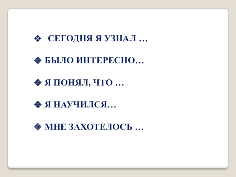 СЕГОДНЯ Я УЗНАЛ …БЫЛО ИНТЕРЕСНО…Я ПОНЯЛ, ЧТО …Я НАУЧИЛСЯ…МНЕ ЗАХОТЕЛОСЬ …