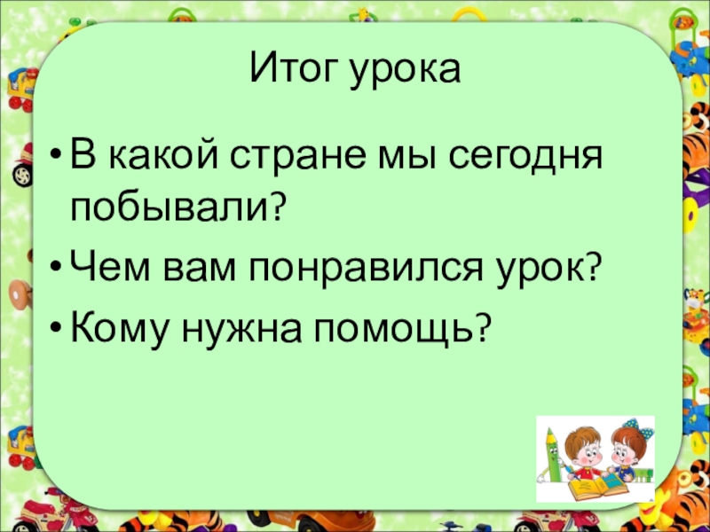 Итог урокаВ какой стране мы сегодня побывали?Чем вам понравился урок?Кому нужна помощь?
