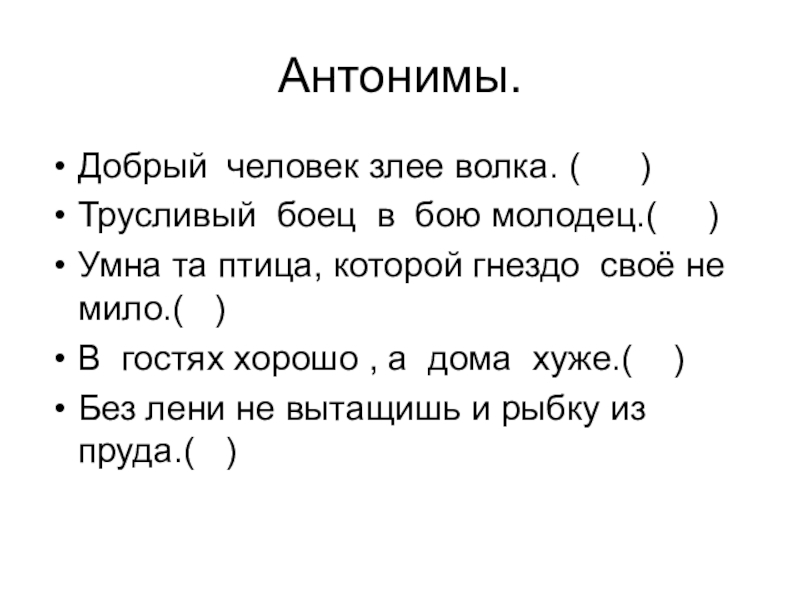 Антонимы.Добрый человек злее волка. (   )Трусливый боец в бою молодец.(   )Умна та птица,
