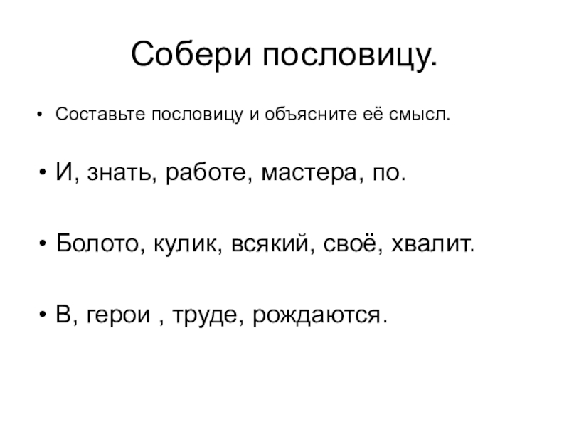Собери пословицу.Составьте пословицу и объясните её смысл.И, знать, работе, мастера, по.Болото, кулик, всякий, своё, хвалит.В, герои ,