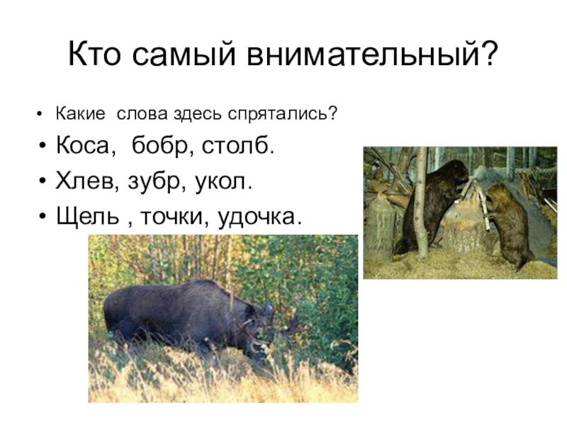 Кто самый внимательный?Какие слова здесь спрятались?Коса, бобр, столб.Хлев, зубр, укол.Щель , точки, удочка.