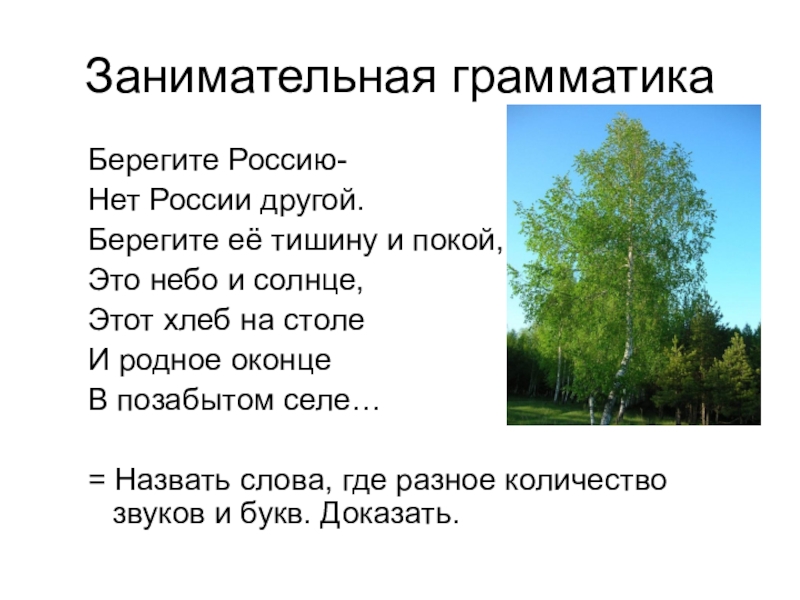 Занимательная грамматикаБерегите Россию-Нет России другой.Берегите её тишину и покой,Это небо и солнце, Этот хлеб на столеИ родное оконцеВ позабытом селе…= Назвать слова, где разное количество звуков и букв. Доказать.